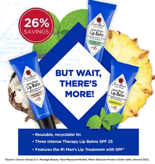 A trio of soothing Intense Therapy Lip Balms SPF 25 featuring award-winning flavor favorites and new Pineapple Mint. Packaged in an exclusive reusable. recyclable Jack Black? tin. this is a gift?Cfor yourself or someone else?Cthat lasts long after the lip balms are gone.